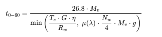 The 0–60 mph acceleration time (t0−60) reflects how effectively the half shaft and drive unit can transmit torque to the ground. It is approximated by: