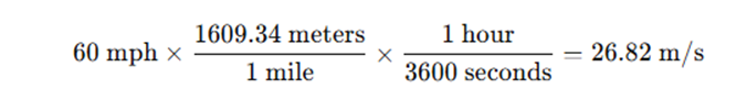 - V is final velocity (60mph ≈26.8 m/s)