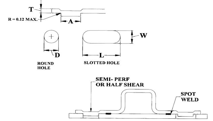| Material Thickness (T, mm) | Semi-Perf Diameter A (mm) | Mating Hole Diameter D (mm) | Mating Slot Dimensions W × L (mm) |
